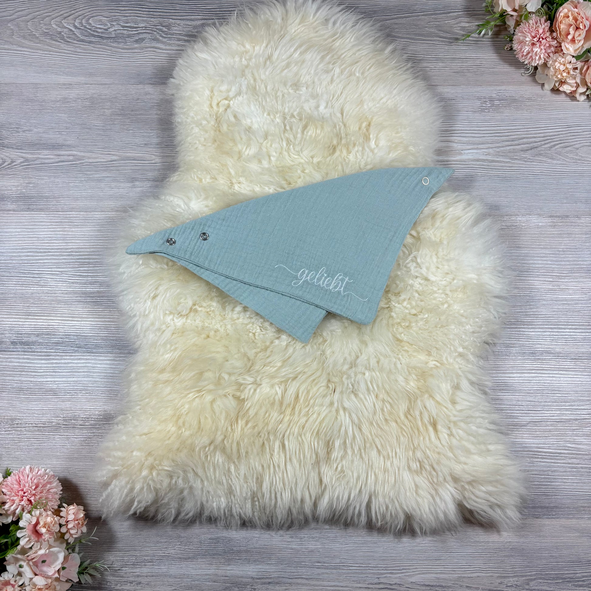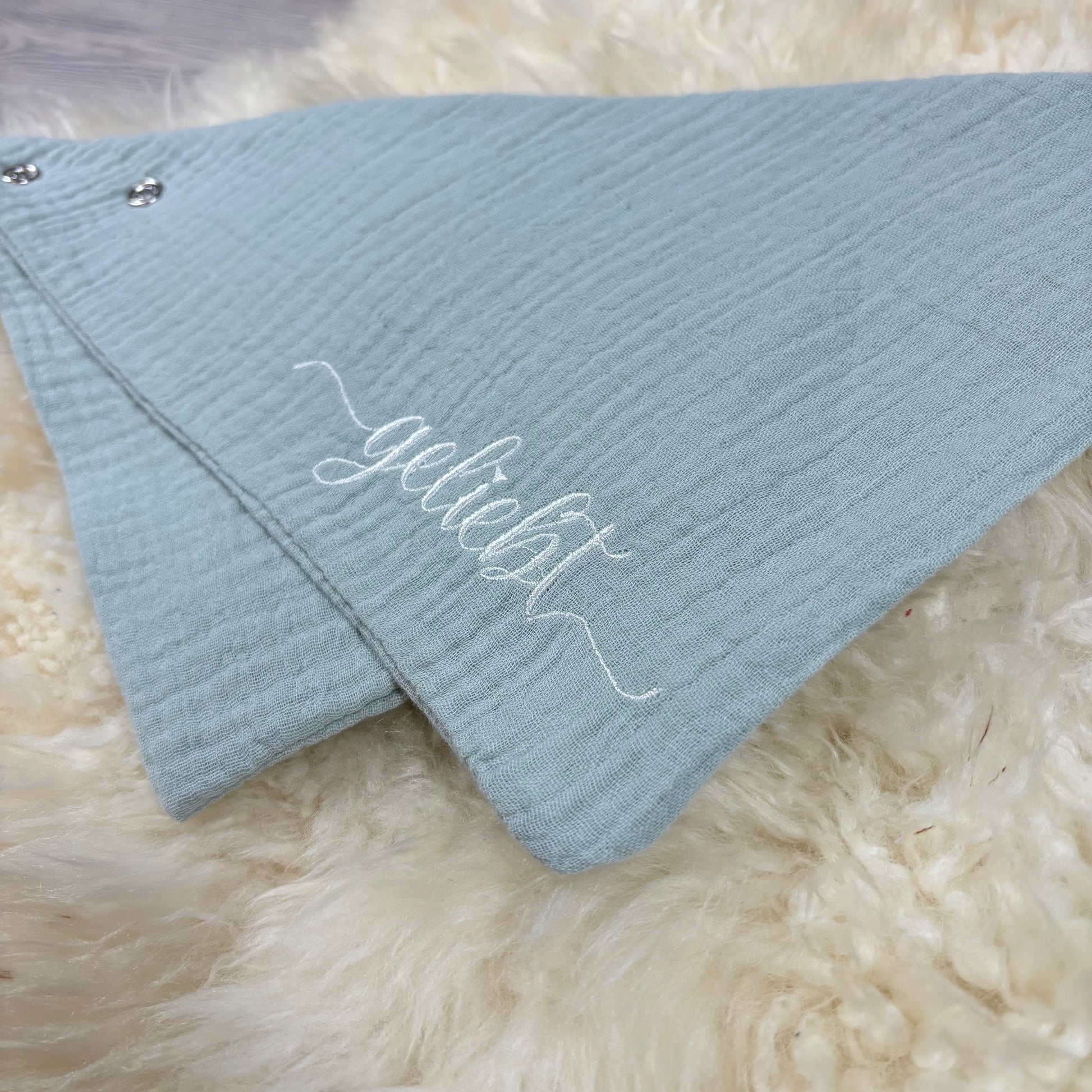 Zartes Musselin-Halstuch mit dem wärmenden Wort "geliebt" bestickt – ein treuer Begleiter für die Kleinsten.