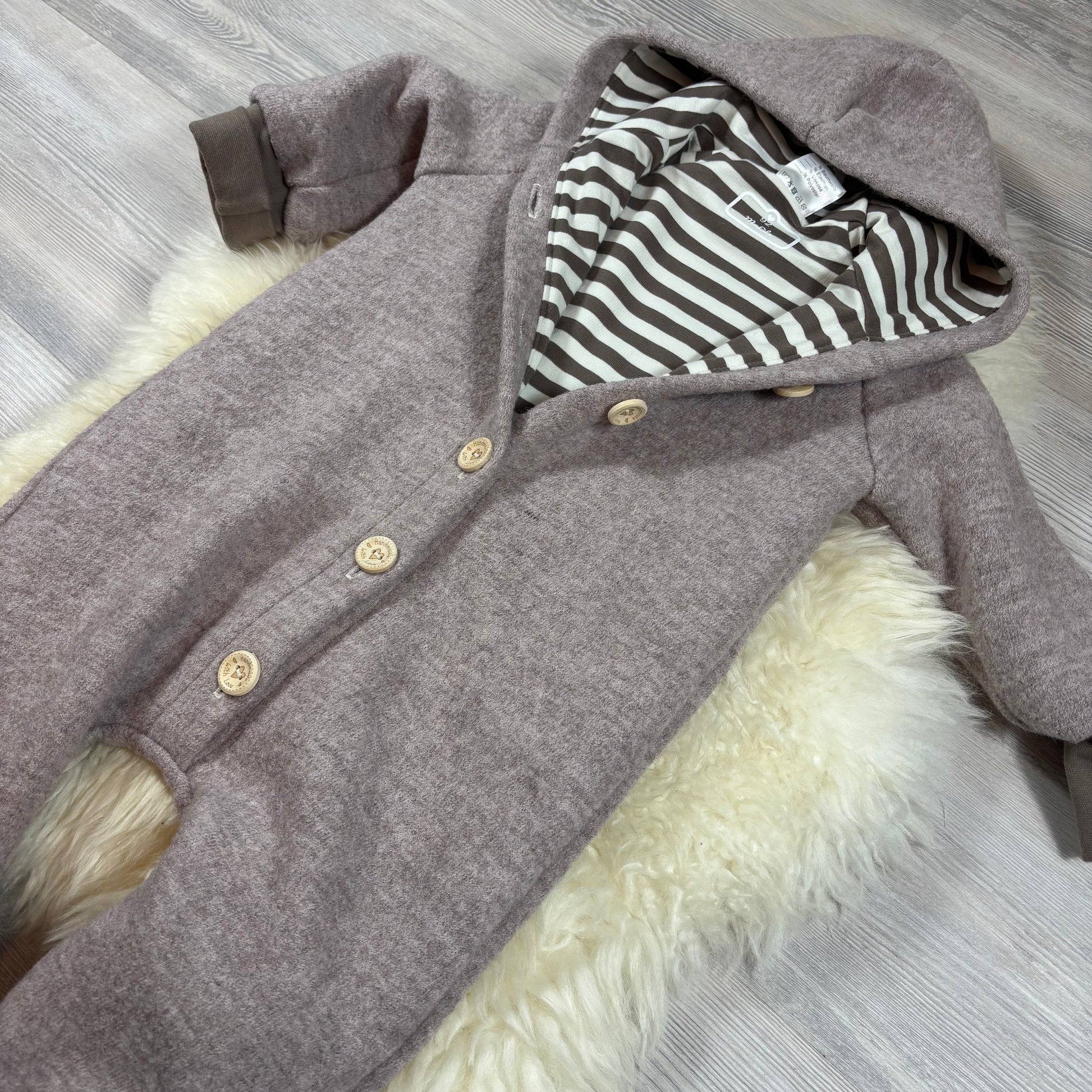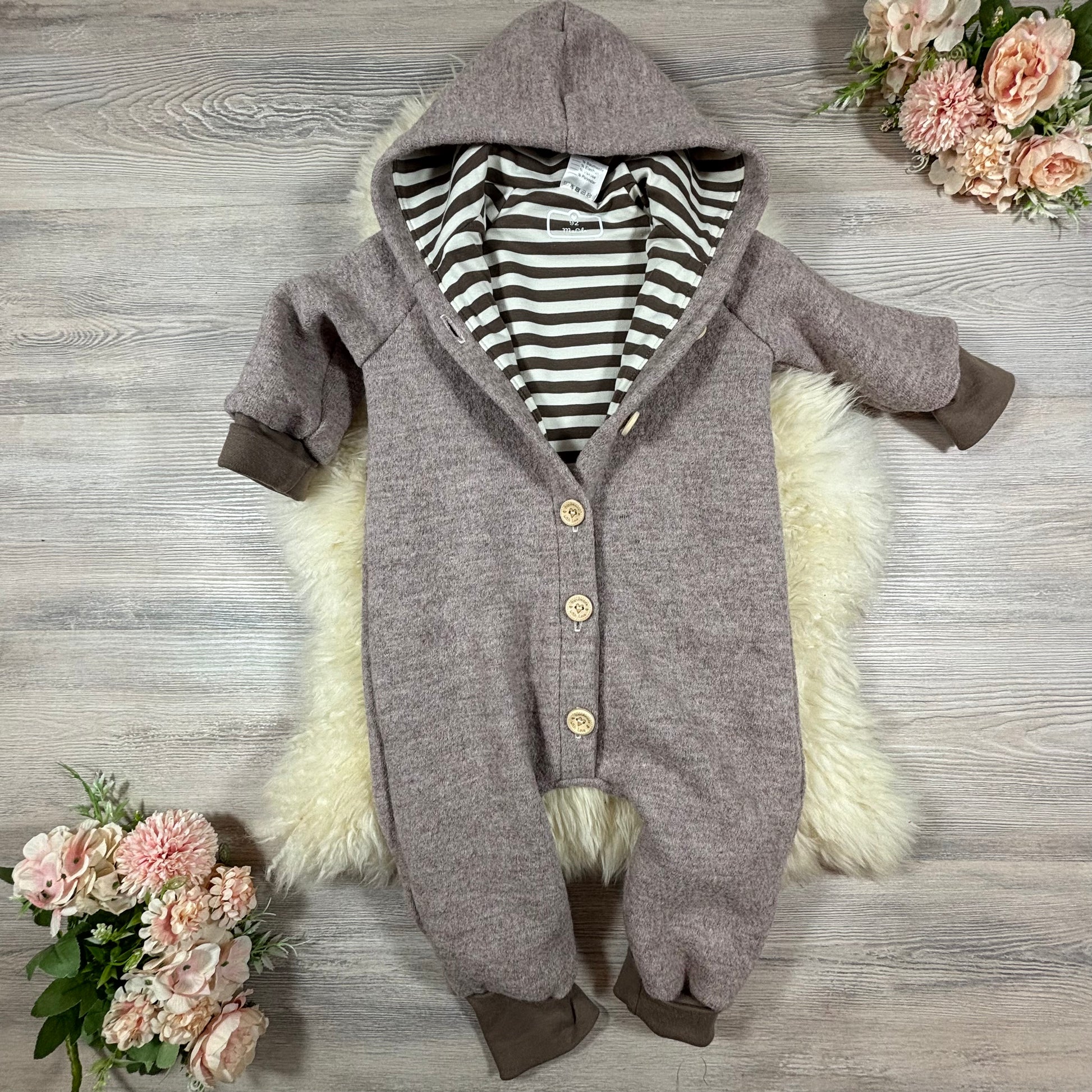 Aufgrund der tollen wärmeregulierenden Eigenschaften des Stoffes, kann er wunderbar von Herbst bis Winter und sogar bis ins Frühjahr hinein getragen werden. Der Overall ist mit Baumwoll-French-Terry gefüttert, hat Holzknöpfe und Bündchen an den Armen und Beinen die aufgeschlagen noch eine Größe mitwachsen und einen Aufhänger um ihn an die Garderobe zu hängen.