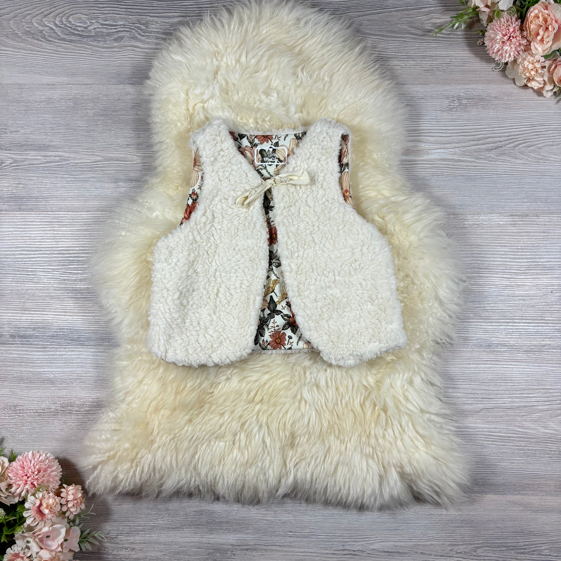 Doppelt gemütlich – diese Teddyweste verbindet das Beste aus zwei Welten! Außen flauschiger Teddystoff für extra Kuschelkomfort, innen weicher Baumwolljersey mit niedlichem Blumendesign.